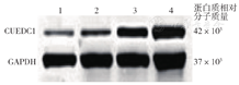 注:1为shCUEDC1-1干扰组;2为shCUEDC1-2干扰组;3为CUEDC1干扰的阴性对照组;4为未经处理的THP-1细胞组