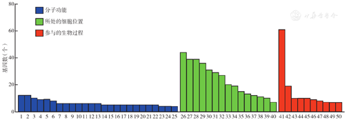 注:1为转录调控,DNA模板化;2为转录,DNA模板化;3为G蛋白偶联受体信号通路;4为信号转导;5为免疫应答;6为中性粒细胞脱颗粒;7为凋亡过程;8为炎症反应;9为氧化还原过程;10为病毒过程;11为转运;12为Ⅰ型干扰素信号通路;13为蛋白泛素化;14为对病毒的反应;15为生物学过程;16为蛋白磷酸化;17为固有免疫应答;18为RNA聚合酶Ⅱ启动子转录的正调控;19为GTPase活性正调控;20为RNA聚合酶Ⅱ启动子转录的负调控;21为蛋白均聚;22为蛋白水解;23为精子形成;24为病毒防御反应;25为干扰素γ介导的信号通路;26为细胞质;27为细胞膜;28为细胞核;29为细胞内液;30为膜的组成成分;31为质膜;32为胞外体;33为核质;34为胞外区;35为细胞间隙;36为细胞内;37为高尔基体;38为线粒体;39为内质网;40为高尔基膜;41为蛋白结合;42为金属离子结合;43为水解酶活性;44为锌离子结合;45为转移酶活性;46为DNA结合;47为核酸结合;48为转录因子活性,序列特异性DNA结合;49为G蛋白偶联受体活性;50为信号传感器活性
