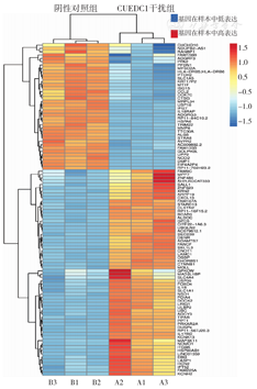 由杭州联川生物有限公司提供技术服务。CUEDC1干扰组与阴性对照组各设3个复孔。总RNA经质检合格后,使用连接有Oligo(dT)的磁珠富集真核生物mRNA。经抽提的mRNA被片段化试剂(fragmentation buffer)随机打断成短片段,以片段化mRNA为模板,用六碱基随机引物合成第一链cDNA,随后加入缓冲液、dNTP、RNaseH和DNA聚合酶Ⅰ进行第二链cDNA合成。应用AMPure XP beads核酸纯化试剂盒纯化双链产物,利用T4 DNA聚合酶和Klenow DNA聚合酶将DNA的黏性末端修复为平末端,3'末端加碱基A并加接头;应用AMPureXP beads核酸纯化试剂盒进行片段选择,最后进行PCR扩增获得最终测序文库。文库质检合格后采用Illumina Hiseq4000系统进行测序,测序读取序列长为双端2×150 bp(PE150)。