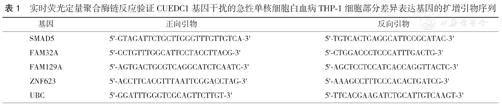 实时荧光定量聚合酶链反应验证CUEDC1基因干扰的急性单核细胞白血病THP-1细胞部分差异表达基因的扩增引物序列