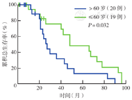 39例B-CLPD-U患者随访至2019年10月,随访资料完整,无失访者。其中31例(79.5%)生存,8例(20.5%)死亡,中位OS时间40.0个月(95% CI 36.0~55.2个月),1年OS率94.1%,3年OS率53.1%(图1)。至随访结束,COP组30例中23例生存,7例死亡;氟达拉滨组9例中,8例生存,1例死亡,两组OS差异无统计学意义(P>0.05)(图2)。年龄>60岁患者OS较≤60岁患者差,差异有统计学意义(P<0.05)(图3),LDH升高患者OS较LDH正常患者差,差异有统计学意义(P<0.05)(图4)。不同性别、Ann Arbor分期、IPI评分、ECOG-PS评分、有无贫血、是否伴有B症状、COP方案为主或以氟达拉滨为主化疗方案和不同ALC患者间OS差异均无统计学意义(均P>0.05)。