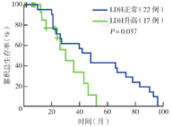Cox回归分析显示,LDH水平和年龄为患者OS的独立影响因素[LDH(≤245 U/L比>245 U/L):HR=0.411,95% CI 0.172~0.981,P=0.045;年龄(>60岁比≤60岁):HR=2.242,95% CI 1.045~4.808,P=0.038]。