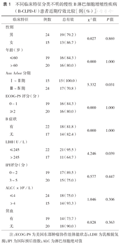 不同临床特征分类不明的慢性B淋巴细胞增殖性疾病(B-CLPD-U)患者近期疗效比较[例(%)]