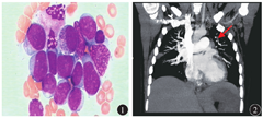 患者,女性,29岁,因头晕、乏力伴面色苍白10余天入住广东省东莞市人民医院血液科。患者急诊血常规示:白细胞计数325×109/L,血小板计数21×109/L,血红蛋白61 g/L,幼稚细胞占0.80。入院查体:体温37.8 ℃,脉搏100次/min,贫血貌,皮肤黏膜未见明显出血点,颈部可触及肿大淋巴结;胸骨压痛明显;双肺呼吸音稍粗,未闻及干、湿啰音;余查体无特殊;既往史、个人史、月经婚育史、家族史均无明显异常。骨髓涂片示:AML骨髓象可见原始粒细胞约占0.775(图1);骨髓染色体核型正常;AML预后突变基因(初级)示:FLT3-ITD阳性、CEBPA-N端转录酶阳性,其余均阴性。患者确诊为AML(非M3型,FLT3-ITD阳性,高危组)[1]。患者入院后予大量补液、羟基脲降白细胞、白细胞单采等积极对症支持治疗。入院第3天突发胸痛、气促,伴呼吸困难,血氧下降至80%。血压110/70 mmHg(1 mmHg=0.133 kPa),心率115次/min,双肺呼吸音粗,双肺可闻及少许散在湿啰音;心脏、腹部查体无特殊。患者急性胸痛合并血氧降低,立即予心电监护、吸氧。凝血功能D-二聚体16.89 μg/mL;血气分析示:氧分压56.5 mmHg,肺泡动脉氧分压差48.3,二氧化碳分压正常。双下肢血管检查:左侧腓静脉静脉血栓形成,余未见异常;肺动脉CT血管造影(CTA)示:右肺下叶肺动脉分支栓塞(图2);B型利钠肽(BNP)、心肌酶、心肌标志物大致正常。结合患者病情,诊断AML合并肺栓塞、左侧腓静脉血栓明确,肺栓塞风险评分(PESI)为Ⅲ级或中危,存在高危因素[2,3];但患者血小板计数低(21×109/L),向患者及家属交代病情及诊治方案后,抗凝方案先选用利伐沙班(20 mg,口服,1次/d),持续应用;同时予吸氧、积极抗感染等治疗后患者胸痛等症状较前好转,在吸氧情况下血氧可维持在95%以上。针对急性白血病方面的治疗:白细胞计数下降至50×109/L以下时予标准IA方案[4](伊达比星10 mg/m2,1次/d,第1至第3天;阿糖胞苷0.1 g,2次/d,第1天至第7天)化疗,常规予升白细胞、成分输血、抗感染治疗后好转出院。出院1周后再次入院,复查肺动脉CTA及下肢血管彩色超声仍提示血栓,持续予利伐沙班抗凝治疗;入院后复查骨髓等检查提示完全缓解,常规予第2个疗程IA方案化疗。患者第3次入院时(距离肺栓塞确诊时间约2个月),复查肺动脉CTA及下肢血管彩色超声提示未见明显异常,已未见血栓形成,持续应用利伐沙班抗凝治疗。后续选用中大剂量阿糖胞苷(阿糖胞苷6 g,第1天至第3天)巩固化疗。随访至截稿前,患者接受第6个疗程中大剂量阿糖胞苷巩固化疗,距离肺栓塞确诊时间约6个月,白血病复查提示持续完全缓解;患者无气促、呼吸困难、胸痛等临床表现,复查肺动脉CTA及双下肢血管彩色超声均未见血栓形成。