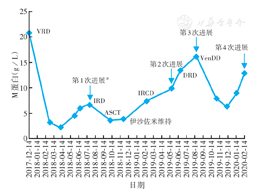 综合国内外文献,建议联合靶向精准治疗,患者治疗意愿强烈,主动要求自购维奈托克。根据病情及耐受性,排除禁忌后,于8月27日予VenDD方案(达雷妥尤单抗16 mg/kg每周1次,地塞米松20 mg每周2次,维奈托克800 mg每天1次),根据血象调整用药间隔时间。10月4日患者因造血细胞三系降低、发热入院,查白细胞计数2.3×109/L,血红蛋白41 g/L,血小板计数24×109/L,IgG 19.50 g/L,sFLC:κ 627.85 mg/L,λ 6.41 mg/L,κ/λ 98.002;病毒检测:人巨细胞病毒DNA阳性;痰培养:克柔念珠菌。结合sFLC及IgG结果,评估原发病病情稳定;造血细胞三系降低考虑与移植后骨髓增殖能力减低,化疗后骨髓抑制、感染相关。暂停第4次达雷妥尤单抗,加强对症抗感染治疗。11月5日门诊复查白细胞计数2.5×109/L,血红蛋白61 g/L,血小板计数50×109/L,M蛋白7.87 g/L,sFLC:κ 786.51 mg/L,λ 5.10 mg/L,κ/λ 154.218,尽管患者因骨髓抑制及感染间断用药,但经过1个疗程VenDD方案治疗后疗效达到PR,患者骨痛症状缓解,ECOG评分1分。11月15日继续予第2个疗程VenDD方案治疗,院外监测白细胞计数维持于(2.2~2.8)×109/L,血红蛋白维持于95~97 g/L,血小板计数波动于(21~45)×109/L,辅以对症支持治疗。12月27日复查M蛋白6.50 g/L,IgG 13.70 g/L,24 h尿κ 200 mg,血红蛋白99 g/L,评估2个疗程疗效为PR。2020年1月10日开始第3个疗程同方案治疗,次日因发热、肺部感染再次停药,经抗感染治疗好转后离院,后续根据血象院外自行口服维奈托克及地塞米松。2020年2月患者因腹主动脉瘤至外院行手术治疗,2月25日复查M蛋白14.10 g/L,IgG 28.15 g/L,提示疾病第4次进展,术后患者发生出血、感染,最终死亡。患者治疗过程中M蛋白水平变化见图1。