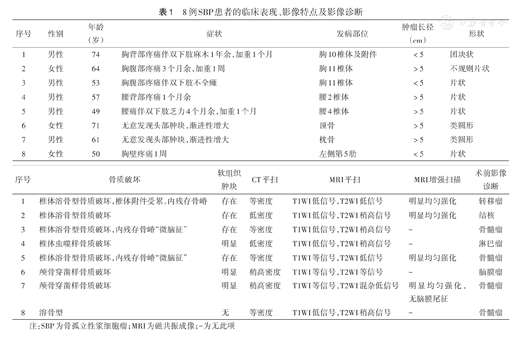 孤立性浆细胞瘤(SP)是以单克隆浆细胞局限性异常增殖为特征的恶性肿瘤,占所有浆细胞瘤的2%~5%[1]。根据病变起源分为骨孤立性浆细胞瘤(SBP)和髓外孤立性浆细胞瘤(SEP),其中SBP占所有SP的70%,主要发生于富含红骨髓的中轴骨,如椎骨、肋骨、骨盆等[2]。早期准确诊断对SBP患者的治疗及预后具有重要价值。SBP临床表现无特异性,CT、磁共振成像(MRI)等影像技术是诊断SBP的最主要方法。然而SBP发病率低,不同部位SBP影像表现缺乏特异性征象,与其他单发病变(如椎体中央型结核、椎体单发转移瘤等)鉴别较困难。本研究分析了临床确诊的8例SBP的CT、MRI表现特点,结合临床表现分析影像误诊的原因及鉴别诊断要点,以提高SBP诊断水平。