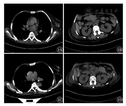 患者既往有高血压病史8年,血压最高达160/100 mmHg(1 mmHg=0.133 kPa);脑梗死半年,左侧肢体活动稍不便。诊断为DLBCL,Ann Arbor分期Ⅲ期B组,非生发中心型,三次打击淋巴瘤;重度贫血;高血压3级(极高危);脑梗死后遗症。2020年11月5日接受1个疗程R2-CHOP方案治疗,具体为来那度胺25 mg,每日口服,第1天至第14天;利妥昔单抗375 mg/m2,静脉注射,第0天;环磷酰胺750 mg/m2,静脉注射,第1天;表柔比星70 mg/m2,静脉注射,第1天;长春地辛4 mg,静脉注射,第1天;地塞米松15 mg,静脉注射,第1天至第5天。服用来那度胺10 d后Plt降至33×109/L,WBC降至0.49×109/L,遂停用。2020年11月22日胸部CT示:双肺条索影,双侧胸膜增厚,右侧乳腺组织缺如;左乳钙化灶(图1A);全腹部CT示:回肠部肿瘤切除并小肠造瘘术后改变,腹盆腔多发占位,腹腔脂肪间隙模糊,胆囊炎,脾脏低密度灶,腹腔小淋巴结(图1B)。2020年11月24日行1个疗程R2-ECHOP(R2-CHOP方案+依托泊苷)方案化疗,加依托泊苷100 mg/m2,静脉注射,第1天至第3天。8 d后Plt降至19×109/L,WBC为1.06×109/L,再次停用来那度胺。2020年12月21日胸部CT示:两肺下叶炎性改变,右肺新增小结节,双侧胸膜增厚,右肺胸腔少量积液,心包积液,右侧乳腺组织缺如;左乳钙化灶,甲状腺左叶钙化灶(图1C);全腹部CT示:腹盆腔多发占位伴局部渗出,胆囊炎,脾脏低密度灶,胰头增大,盆腔少量积液(图1D)。化疗期间患者出现骨髓抑制,予输注红细胞、血小板、粒细胞集落刺激因子(G-CSF)、血小板生成素(TPO)等对症处理。2次化疗后,患者颈部、肺门及纵隔淋巴结缩小,其余各处淋巴结未见增大。