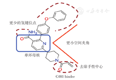作为新型不可逆共价结合的BTK抑制剂,奥布替尼在第一代BTK抑制剂基础上进行了结构优化,其具有更小的空间夹角,三维结构与BTK活性中心更匹配,提高了BTK的激酶抑制性和选择性;其采用单环母核,减少了铰链区H键结合位点,降低与其他激酶结合的可能,去除手性中心,减少空间构象(图1),从而避免与其他激酶的相互结合,提高了激酶选择性。结构的优化保证了奥布替尼具有最佳激酶选择性,降低了脱靶效应,使奥布替尼拥有更好的疗效和安全性。