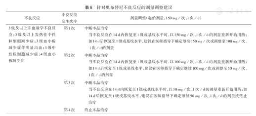 | 当不良反应在14 d内恢复至1级或基线水平时,以100 mg/次、1次/d的剂量重新开始用药;如14 d后恢复至1级或基线水平,建议在医师指导下确定继续100 mg/次或调整至50 mg/次、1次/d的剂量 | |||