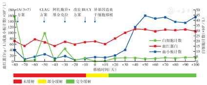 2020年5月22日回输胞兄(37岁,男供女,Rh阳性O型血供Rh阳性O型血)经G-CSF动员的外周血造血干细胞,其中单个核细胞数6.40×108/kg、CD34+细胞数5.76×106/kg、CD3+细胞数1.93×108/kg。输注过程顺利。+13天粒系重建,复查骨髓形态示有核细胞增生活跃,原始幼稚细胞占0.02,MRD<1.9×10-3。5月29日供体细胞嵌合率达64.5%;+100天复查示骨髓形态学缓解中,MRD 1.0×10-4,短串联重复序列(STR)98.0%。疾病状态动态变化情况见表1。患者移植预处理化疗耐受性良好,其间偶有恶心、呕吐及黏膜炎,无发热、活动性出血、GVHD、肝静脉闭塞病等发生。围移植期血细胞动态变化情况见图1。