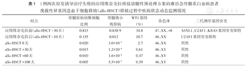 1例两次原发诱导治疗失败的应用维奈克拉桥接清髓性预处理方案的难治急性髓系白血病患者挽救性异基因造血干细胞移植(allo-HSCT)移植过程中疾病状态动态监测情况