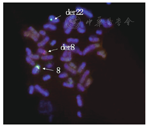 注:图中箭头均显示该患者骨髓细胞G带核型存在t(8;22)(p11;q11)