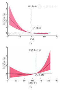 本研究236例患者中位年龄63岁,3年OS率46%,这与多数研究结果相一致。本研究单因素分析显示初诊时的PNI、年龄、血红蛋白、IPI、Ann Arbor分期、ECOG PS评分、β2-MG、LDH、肝脏是否受累、中枢神经系统是否受累、bcl-2、铁蛋白、是否有大包块是DLBCL患者预后的影响因素(P<0.05)。多因素分析显示,PNI、中枢神经系统是否受累、血红蛋白、肝脏是否受累、IPI、年龄、是否有大包块为DLBCL预后的独立影响因素(P<0.05)。Ann Arbor分期、ECOG PS评分等在单因素分析中对预后有影响,但多因素分析中并非独立的预后因素,与既往相关研究的多因素分析结果不符,这可能与不同患者的临床特征不同有关。同时,本研究结果显示PNI、年龄与DLBCL预后不良风险之间呈非线性效应。当PNI≥49时,DLBCL患者的预后不良风险比呈非线性下降;当年龄≥63岁时,DLBCL患者的预后不良风险比逐渐升高。表明低PNI和年龄较大的患者预后不良风险可能会增加。本研究也探讨了PNI在部分亚组中的预后价值,结果发现PNI能区分患者的不同预后结局。在GCB型、bcl-2阳性以及bcl-6阳性患者中,PNI≥49的患者比PNI<49的患者具有更好的OS(均P<0.01)。总之,在DLBCL治疗新时代,我们应该将临床特征与免疫组织化学指标结合,才能更准确地判断患者的生存预后结局。