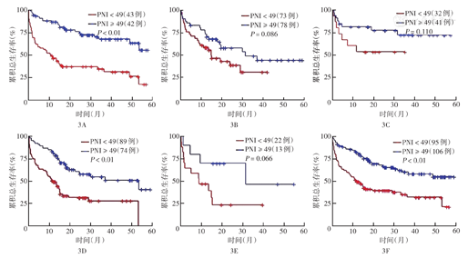 85例GCB型患者中,PNI<49和PNI≥49患者3年OS率分别为31%和70%,差异有统计学意义(P<0.01);151例non-GCB型患者中,PNI<49和PNI≥49患者3年OS率分别为28%和51%,差异无统计学意义(P=0.086)。163例bcl-2阳性患者中,PNI<49和PNI≥49患者3年OS率分别为27%和52%,差异有统计学意义(P<0.01);73例bcl-2阴性患者中,PNI<49和PNI≥49患者3年OS率分别为51%和74%,差异无统计学意义(P=0.110)。201例bcl-6阳性患者中,PNI<49和PNI≥49患者3年OS率分别为30%和59%,差异有统计学意义(P<0.01);35例bcl-6阴性患者中,PNI<49和PNI≥49患者3年OS率分别为25%和48%,差异无统计学意义(P=0.066)(图3)。