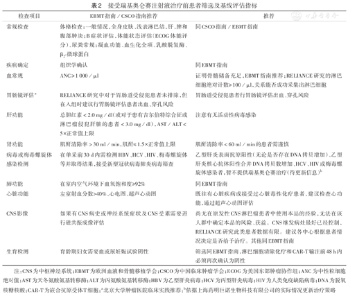 | CNS影像 | 如果有CNS病史或神经系统症状及CNS受累需要进行磁共振成像评估 | 尚无在原发性CNS淋巴瘤患者中使用本品的经验,无法在该人群中确定本品的风险、获益。CNS继发病灶最好已经控制,RELIANCE研究此类患者数据有限。建议各中心根据患者情况决定是否给予治疗。其他同EBMT指南 |