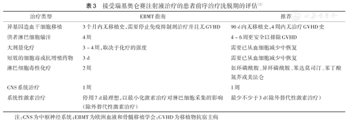 如果淋巴细胞清除和CAR-T输注间隔超过3周,同时白细胞计数>1.0×109/L,需要考虑在CAR-T输注前再次进行淋巴细胞清除化疗。淋巴细胞清除化疗比最初预计的开始时间延迟超过14 d时,可能需要重新进行患者评估[2]。