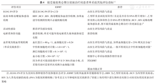 (1)单采前需评估前序治疗的洗脱情况(表3)及感染情况、血液学检测和凝血功能(表4)。(2)单采中及单采后需检查患者生命体征;密切观察并评估疑似单采相关不良反应[2,7,8,9]。