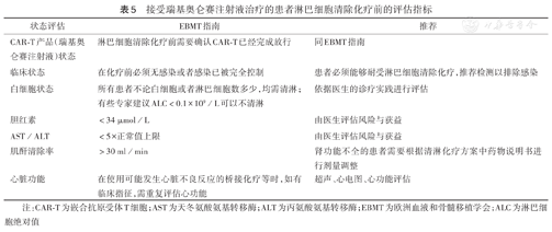 注:CAR-T为嵌合抗原受体T细胞;AST为天冬氨酸氨基转移酶;ALT为丙氨酸氨基转移酶;EBMT为欧洲血液和骨髓移植学会;ALC为淋巴细胞绝对值