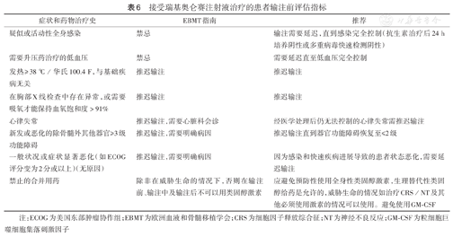 | 疑似或活动性全身感染 | 禁忌 | 输注需要延迟,直到感染完全控制(抗生素治疗后24 h培养阴性或多重病毒快速检测阴性) |