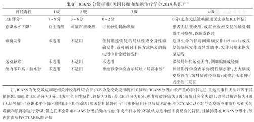 注:ICANS为免疫效应细胞相关神经毒性综合征;ICE为免疫效应细胞相关脑病;aICANS分级由最严重的事件决定,且这些事件无法归因于其他原因,如患者ICE评分为3分,且发生全身性发作,评估为3级;若ICE评分为0分,患者可被评估为3级(清醒且完全失语),也可以被评估为4级(无法唤醒);b意识水平下降不能归因于其他原因(如未使用镇静药);c可根据通用不良反应术语标准(CTCAE)v5.0对与免疫效应细胞疗法相关的震颤和肌阵挛进行分级,但它们不会影响ICANS分级;d颅内出血(伴或不伴水肿)不被认为是神经不良反应的特征,且被排除在ICANS分级中,颅内出血应按CTCAE标准评估