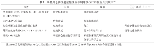 CAR-T输注后中期可能出现的不良反应包括迟发性TLS、迟发性组织淋巴细胞增生/巨噬细胞活化综合征、CRS、B细胞发育不良、低丙种球蛋白血症、感染。血细胞减少常见,但通常数月后会逐渐恢复。欧洲血液和骨髓移植协会(EBMT)推荐在此阶段需要做的检测及其频率见表9[2,3,11,12]。