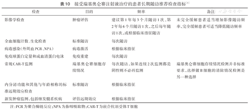 对于CAR-T治疗的长期效应现在所知较少,已发现的并发症主要为长期血细胞减少和低丙种球蛋白血症,理论上还有继发肿瘤、NT和自身免疫病[2]。建议在长期的随访中应该组建多学科诊疗(MDT)团队以监测疾病状态、relma-cel治疗和之前治疗的远期效应等。MDT团队需要包括负责relma-cel治疗的医生、疾病专科医生、长期随访护士、数据管理者等。建议对于病情稳定的患者远期效应随访监测频率为输注后100 d随访1次,输注后6个月再次随访,之后每年随访1次或根据临床需要(表10)。