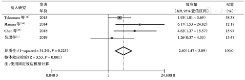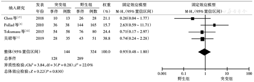 4篇研究评估C-KIT突变对EFS的影响,无明显异质性(I2=22.0)(图1),突变组及野生组在CR中差异无统计学意义(P=0.830)。同时使用Begg's和Egger's检验评估发表偏倚(Begg's P=1.000,Egger's P=0.744),故不存在发表偏倚。