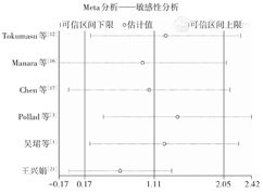 6个研究评估C-KIT突变对OS的影响,合并后结果显示野生组OS优于突变组,差异有统计学意义(P=0.020);同时研究之间存在异质性(P=0.065,I2=51.8%)(图3),通过敏感性分析(图4),寻找异质性主要来源;在王兴娟[21]研究内容中,突变组随访时间约为30个月,其他研究均在5年左右。将该研究剔除后,异质性降低(P=0.498,I2=0),合并后结果显示,突变组及野生组间OS差异无统计学意义(P=0.065)。
