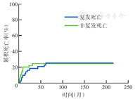截至随访结束,共15例患者死于疾病复发,其中12例在移植后1年内早期复发死亡,3例在移植1年后复发死亡。5年OS率、PFS率分别为51.8%、47.8%,10年OS率、PFS率分别为51.3%、43.1%,预计中位OS时间为63个月。5、10年累积疾病复发率为38.6%、45.4%,5年累积非复发相关死亡(NRM)率为25.0%。生存超过5年的患者仅1例死亡(图1、图2)。