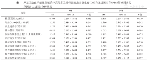 异基因造血干细胞移植治疗高危多发性骨髓瘤患者总生存(OS)和无进展生存(PFS)影响因素的单因素Cox回归分析结果
