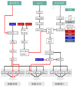 首先将本例患者的二代测序(NGS)报告和存在的KMT2A-AFDN(即MLL-AF6)融合基因输入TRI生物模拟平台。患者NGS报告中显示观察到52个突变,关键突变及其影响如下:BRAF V600E、KMT2C、ERCC6和TP53的致病性错义突变,ERCC2和KMT2D的移码突变;KMT2C和KMT2D的缺失通过H3K4甲基化导致DNA错配修复(MMR)信号通路的下调[5,6,7,8];由于BRAF有害的错义突变,细胞外信号相关激酶(ERK)信号通路上调[9]。预测到克拉屈滨和曲美替尼联合的推荐方案应答指数最佳,而经模拟预测显示,加入低剂量阿糖胞苷的三药联合推荐方案具有协同作用且应答良好。推荐方案所依据的分子基因层级的发病机制(图1):(1)曲美替尼是一种可逆的MEK1和MEK2活化的变构抑制剂,MEK1和MEK2是ERK信号通路的上游调控因子,促进细胞增殖。BRAF突变导致的ERK信号通路上调可使患者对曲美替尼敏感[10]。(2)阿糖胞苷是嘧啶类似物,在复制过程中掺入DNA中,干扰DNA合成,导致单链断裂,最终使细胞凋亡[11]。MMR信号通路下调可使患者对阿糖胞苷敏感[12]。(3)克拉屈滨是一种嘌呤类似物,它被脱氧腺苷激酶(dCK)磷酸化为活性形式2CdATP,然后掺入DNA中,干扰DNA合成,导致单链断裂,最终导致细胞凋亡[13]。克拉屈滨还能抑制核糖核酸还原酶,导致白血病细胞中三磷酸阿糖胞苷积聚,增加了阿糖胞苷联合克拉屈滨的疗效[14,15]。