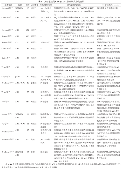 | Castro等[23] | AML | 57 | 回顾性 | - | 预测CBFB-MYH11组的6号三倍体、RUNX1-RUNX1T1组的EZH2突变、CEBPα组的DNMT3A功能缺失与化疗耐药相关 | 预测3组预后良好的AML存在耐药突变,提出耐药机制 |