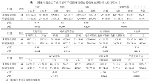 围化疗期是否存在明显尊严受损淋巴瘤患者临床病理特征比较[例(%)]