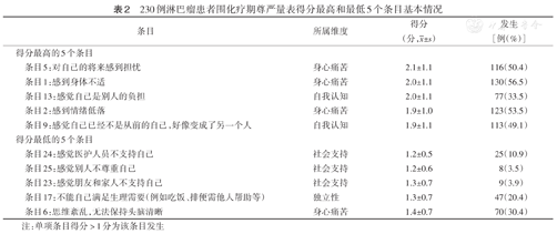 230例淋巴瘤患者围化疗期尊严量表得分最高和最低5个条目基本情况
