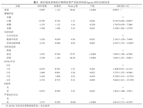 淋巴瘤患者围化疗期明显尊严受损多因素logistic回归分析结果
