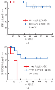 30例患者中16例进行了靶向测序,共检测出36个基因发生突变。其中1例为原发患者,存在PIM1和PRDM1突变,其余15例均为继发患者。突变频率>20%的基因为PIM1(8例)、MYD88(6例)、KMT2D(5例)、TP53(5例)、CARD11(4例)、CCND3 (4例)、GNA13(4例)(图2)。生存分析结果显示,TP53突变患者OS和PFS均较TP53未突变患者差,差异均有统计学意义(P值分别为0.002、0.012)(图3)。