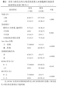 原发与继发女性生殖系统弥漫大B细胞淋巴瘤患者临床特征比较[例(%)]