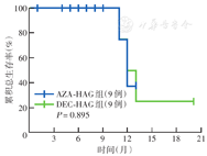 AZA-HAG组治疗1个疗程后总体有效及CR+CRi均7例,DEC-HAG组均8例,差异均无统计学意义(均P=1.000)。AZA-HAG组1例TP53突变和1例ASXL1+ RUNX1突变患者均获CR,1例NPM1野生型合并FLT3-ITD、ASXL1突变患者未缓解。AZA-HAG组中位达CR+CRi时间为1.5个月(0.5~3.0个月)。中位随访12个月(1~20个月),随访率100%。两组CR+CRi中位持续时间均为7个月,中位OS时间均为12个月;两组OS差异无统计学意义(χ2=0.02,P=0.895)(图1)。