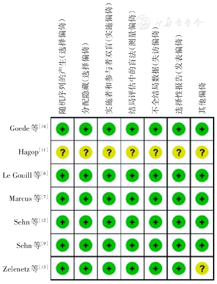 根据Cochrane偏倚风险评价标准评估显示,5项研究的选择偏倚风险较低(充分的分配隐藏和序列生成);所有研究均为开放标签研究;1项未发表的研究没有报告随机分配生成和隐藏方法,被判断为选择偏倚风险未知(图1)。