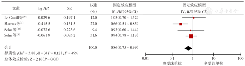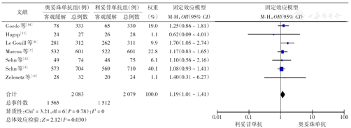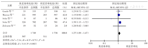 共纳入7项随机对照试验,包括4 235例患者(滤泡淋巴瘤1 430例,弥漫大B细胞淋巴瘤2 102例,其他B-NHL患者703例),奥妥珠单抗组和利妥昔单抗组分别有2 121例和2 114例。在可评价的4 162例患者中,奥妥珠单抗组患者客观缓解率(ORR)高于利妥昔单抗组[75.1%(1 565/2 083)比72.7%(1 512/2 079);OR=1.19,95% CI 1.01~1.41,P=0.03]。奥妥珠单抗组患者无进展生存(PFS)优于利妥昔单抗组(HR=0.86,95% CI 0.75~0.99,P=0.03)。在可评估不良反应的3 542例患者中,奥妥珠单抗组3~4级不良反应发生率高于利妥昔单抗组[61.8%(1 098/1 776)比54.2%(958/1 766);OR=1.50,95% CI 1.29~1.74,P<0.001],其中奥妥珠单抗组3~4级输液相关不良反应发生率[7.5%(158/1 776)比3.1%(65/1 766);OR=2.56,95% CI 1.91~3.45,P<0.001]和中性粒细胞减少发生率[34.1%(597/1 749)比29.4%(511/1 738);OR=1.27,95% CI 1.09~1.47,P=0.002]均高于利妥昔单抗组。