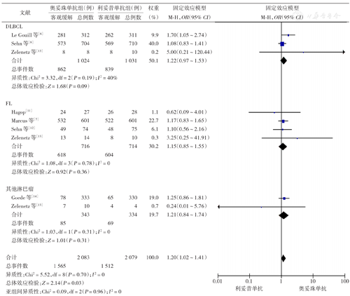 纳入的所有7项RCT均评估了ORR[6,7,9,11,12,13,14]。在可评估疗效的4 162例患者中,奥妥珠单抗组ORR高于利妥昔单抗组[75.1%(1 565/2 083)比72.7%(1 512/2 079);OR=1.19,95% CI 1.01~1.41,P=0.03],各研究结果间无异质性(I2=0)(图2)。组织学类型亚组分析中,FL[7,11,12,13]、DLBCL[6,9,13]、其他类型[13,14]利妥昔单抗组和奥妥珠单抗组间ORR差异均无统计学意义(均P>0.05),各项研究结果间无异质性(I2=0)(图3)。