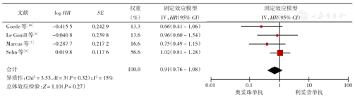 7项RCT中4项用HR评估PFS[6,7,9,12]。与利妥昔单抗组相比,奥妥珠单抗治疗组PFS明显获益(HR=0.86,95% CI 0.75~0.99,P=0.03),各项研究结果间具有中等异质性(I2=49%)(图4)。有4项研究用HR评估了OS[6,7,9],奥妥珠单抗组OS较利妥昔单抗组未显示出更好的获益(HR=0.95,95% CI 0.79~1.15,P=0.61),4项研究结果间无异质性(I2=0)(图5)。