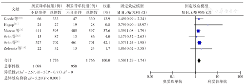 6项RCT报告了3级或4级不良反应的总体发生率[7,9,11,12,13,14],在可评价的3 542例患者中,奥妥珠单抗组3~4级不良反应发生率高于利妥昔单抗组[61.8% (1 098/1 776)比54.2%(958/1 766);OR=1.50,95% CI 1.29~1.74,P<0.001](图6),其中奥妥珠单抗组3~4级输液相关不良反应(IRR)发生率[7.5%(158/1 776)比3.1%(65/1 766);OR=2.56,95% CI 1.91~3.45,P<0.001]和中性粒细胞减低发生率[34.1%(597/1 749)比29.4%(511/1 738);OR=1.27,95% CI 1.09~1.47,P=0.002]均高于利妥昔单抗组,各项研究间的异质性较低(I2值分别为0、22%)(图7、图8)。
