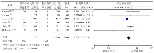 不良反应是临床用药需要考虑的另一个重要因素。B-NHL患者接受奥妥珠单抗方案治疗有更高的3级或4级不良反应发生风险,如更多的感染、IRR、血小板减少症和心脏事件发生[17]。本Meta分析结果与已知的奥妥珠单抗不良反应相关报道一致,相较于利妥昔单抗,奥妥珠单抗治疗发生3 ~ 4级IRR风险更高(7.5%比3.2%)。白细胞介素(IL)-6、IL-8、CCL3和干扰素γ(IFN-γ)等细胞因子的释放可通过减少自然杀伤(NK)细胞的循环快速破坏B细胞,诱导IRR的发生[18,19]。根据GAINED研究的观察结果,IRR通常发生在第1次输注期间[6],通过提前应用对乙酰氨基酚、苯海拉明和糖皮质激素等药物或降低输注速度、暂停输注可减少IRR的发生及降低其严重程度[20]。另外,本Meta分析结果显示,与利妥昔单抗组相比,奥妥珠单抗组3~4级中性粒细胞减低的发生率也较高。予粒细胞集落刺激因子等对症处理后,患者中性粒细胞减低可得到控制。