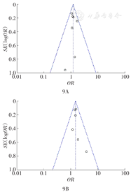 纳入的研究中,大样本试验相对集中分布于漏斗中部,小样本试验散在分布于漏斗底部。因原始资料可能存在发表偏倚,局部可能不规则,但总体未见明显发表偏倚(图9)。