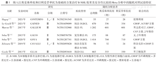 纳入以奥妥珠单抗和以利妥昔单抗为基础的方案治疗B-NHL效果及安全性比较的Meta分析中的随机对照试验特征