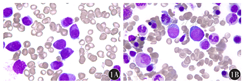为进一步治疗赴外院就诊。骨髓象:粒系比例减低,红系比例增高,巨核系增生伴三系发育异常,可见原始细胞约0.17,不除外MDS-EB2。骨髓活组织检查:骨髓增生较活跃(60%~70%),粒红系比例减小,幼稚阶段细胞轻度增多,以中幼及以下阶段粒系细胞为主,红系各阶段细胞可见,核左移,以中晚幼红细胞为主,巨核细胞不少,分叶核为主,可见分叶少的巨核细胞,少量淋巴细胞散在分布,形态成熟。流式细胞术检查:成熟淋巴细胞群13.6%,幼稚及成熟粒细胞群42.9%,幼稚红细胞群33.5%,异常细胞群约占有核细胞8.4%,强表达CD117,表达CD34、HLA-DR、CD38、CD13,弱表达MPO,部分细胞弱表达CD11b,不表达CD33、CD16、CD15、CD123、CD64、CD7、CD56、CD14、CD36、CD19、CD10、TDT、cCD79a、cCD3,为异常髓系原始细胞表型。粒系SSC减小,核左移,部分细胞CD15、MPO表达减弱,CD13/CD16、CD13/CD11b分化抗原表达异常;红系比例偏高,部分细胞CD36、CD71表达减弱或缺失。分子生物学检查:白血病43种融合基因筛查均阴性。染色体核型:43~44,X,add(X)(q28),del(4)(q?13q31),add(7)(p11.1),del(11)(q13q23),del(17)(p11.2),-18,add(21)(p13),-22,+1~2mar,inc[cp20]。34项基因突变筛查发现TP53突变,突变位点同上,变异比例为82.6%。荧光原位杂交(FISH)检查显示:TP53基因缺失阳性,其中17%细胞为-17。综上诊断为t-MDS(RAEB-2,APL转化)。患者因肺部感染严重,于2020年1月26日死亡。