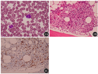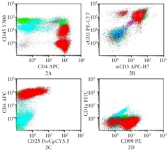 例1,男性,54岁,2019年7月以左侧咽部异物感为主诉就诊,术后病理提示左侧咽部乳头状瘤,但多次复查血常规发现白细胞计数明显升高,追问病史,患者近一年出现皮疹,近半年反复口腔溃疡,可自行愈合,1周前出现外阴溃疡。查体:左侧肩背部、右前臂、腰部、两侧臀部以及双侧足背部皮肤可见广泛片状隆起,伴脱屑,无皮肤抓痕,溃疡位于外唇、舌部。血常规示:白细胞计数20.05×109/L,淋巴细胞绝对值15.15× 109/L,血红蛋白和血小板计数正常,无高钙血症。细胞形态:外周血涂片中异型淋巴细胞("花细胞")占0.360(图1A),骨髓涂片中该类细胞占0.145;骨髓活组织检查:低倍镜下骨髓受累不明显,高倍镜下见少量中等大、形态不规则淋巴细胞散在分布(图1B),CD3染色显示其分布模式(图1C)。流式细胞学:以CD45/CD4设门,发现一群CD4阳性的异常T细胞大部分CD45表达缺失(红色细胞群),占有核细胞的59.78%,表达cCD3、CD2、CD5,部分表达CD25、CD7和CD99,mCD3部分表达缺失,不表达CD8、CD1a、CD34、TdT(图2)。血清学检查示HTLV-1/HTLV-2抗体阳性。