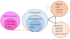 注:MRD为微小残留病;MFC为多参数流式细胞术;RQ-PCR为实时定量聚合酶链反应;NGS为二代测序;中间3个圆圈的逻辑关系提示MRD的概念虽然来源于急性白血病,但已外延至其他恶性血液病和实体肿瘤;左侧2个圆圈表明传统的MRD概念是指用外周血或骨髓标本检测到的残留白血病细胞,MRD概念还包括髓外病变;右侧2个圆圈分别代表MRD检测技术和临床应用,MRD概念的提出促进了检测技术的进步和临床应用,而临床应用过程中发现的问题和技术进步丰富了MRD概念的内涵和外延