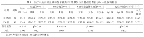 | 非PN组 | 31 | 63±9 | 15(48.4) | 16(51.6) | 9(29.0) | 12(38.7) | 10(32.3) | 9(29.0) | 3(9.7) | 19(61.3) | 14(45.2) | 7(22.6) | 8(25.8) | 2(6.5) |